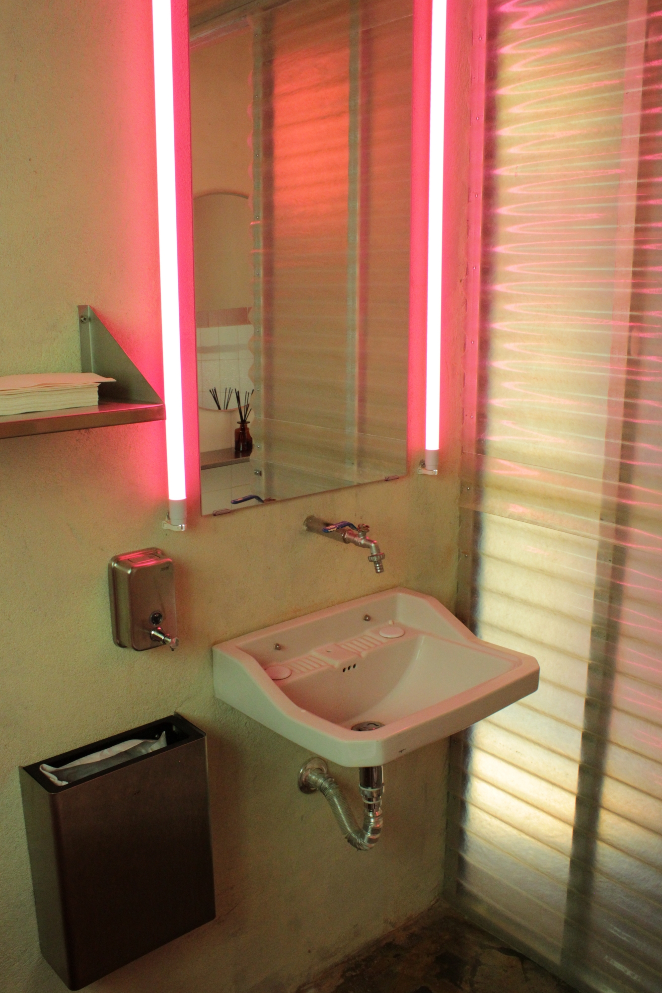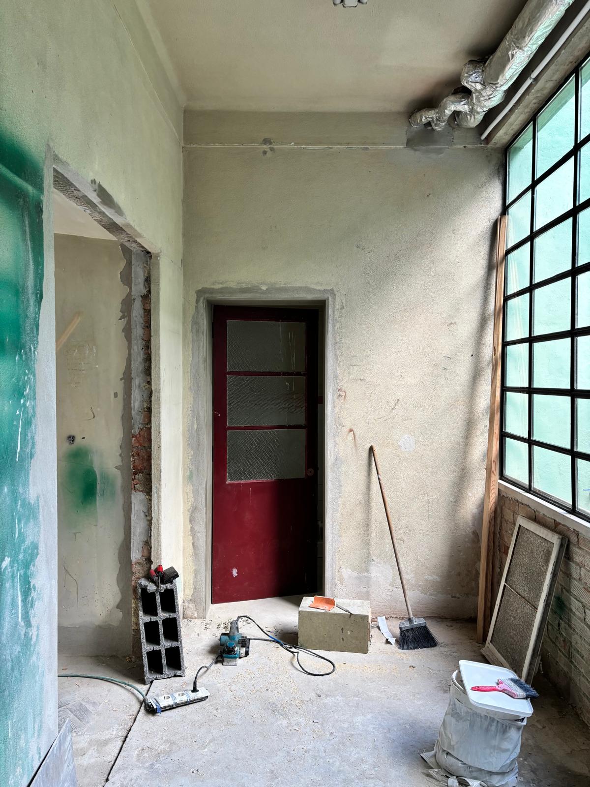 For the restroom, Novonovo salvaged and reintroduced a set of elements from a building slated for demolition in downtown Lisbon—a door, a sink, and a toilet. These components were carefully dismantled, sanitized, and reintegrated into the new context, extending their lifespan.
