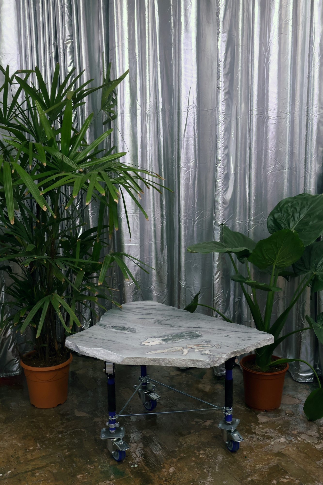 In total, 14 tables were produced, arranged as geographical fragments that evoke the different continental masses of the ancient Gondwana: one Africa (divided into two parts), eight Indias, two Antarcticas, one America (also divided into two), and two Australias. This arrangement reinforces the interpretation of the ensemble as a modular composition that, when assembled, allows for the symbolic reconstruction of the original supercontinent through its constituent parts.