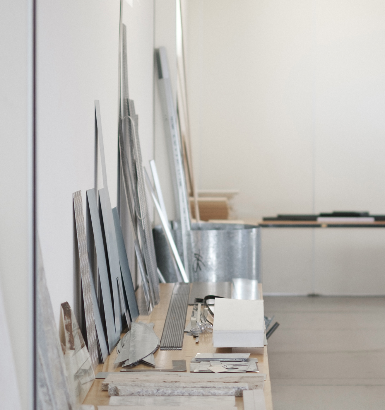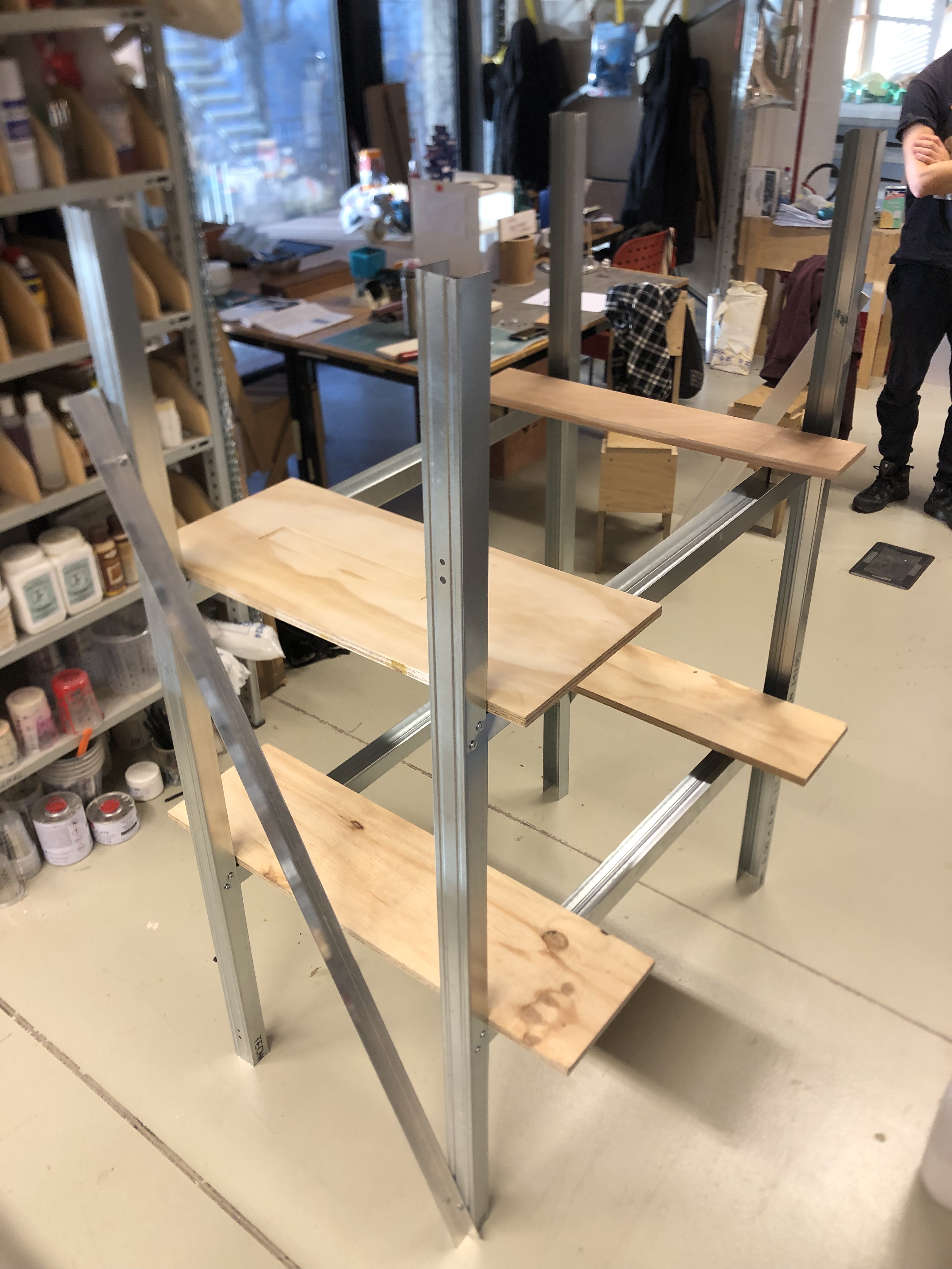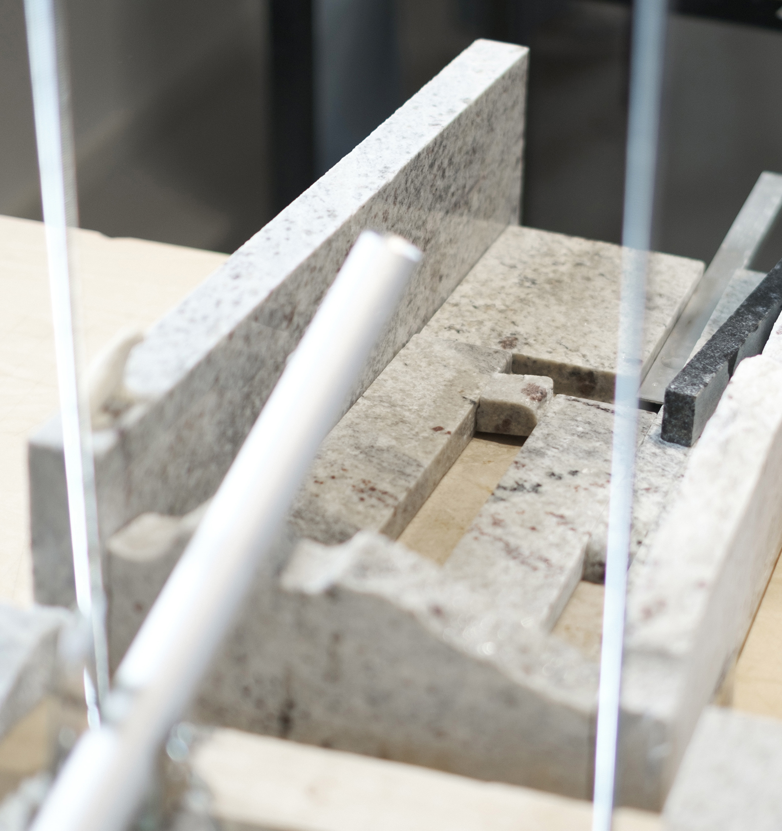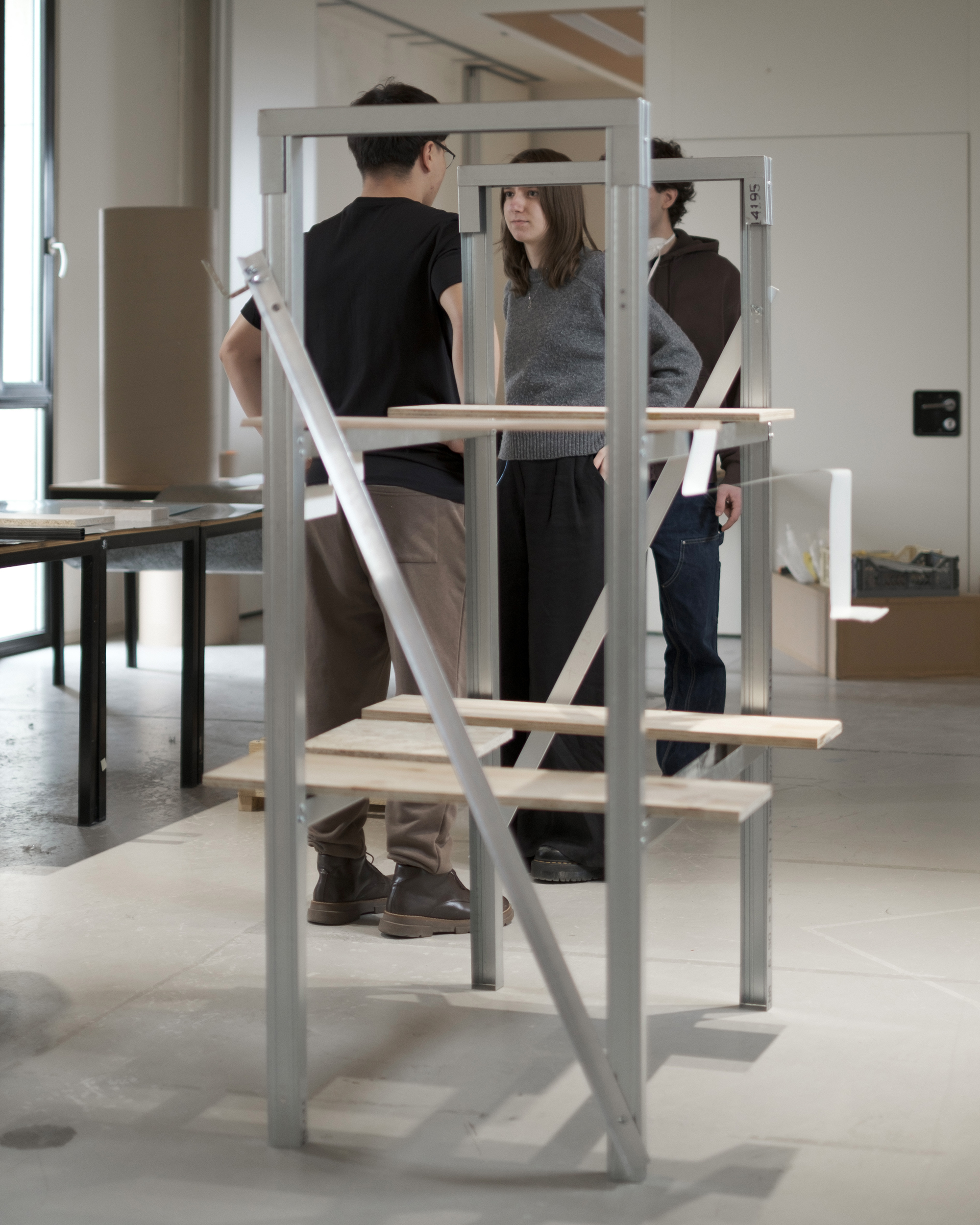 From this process emerged objects that directly reflect the properties and constraints of the available materials, revealing diverse approaches to design. Among the outcomes are a shoe-cleaning device made from anti-slip metal sheets, incorporating a hidden compartment for collecting dirt; a reconfigurable shelving unit developed from aluminum profiles, allowing multiple compositions through adjustable wooden shelves, a fountain inspired by Japanese tradition, where stone elements are held together by pressure without permanent fixings.