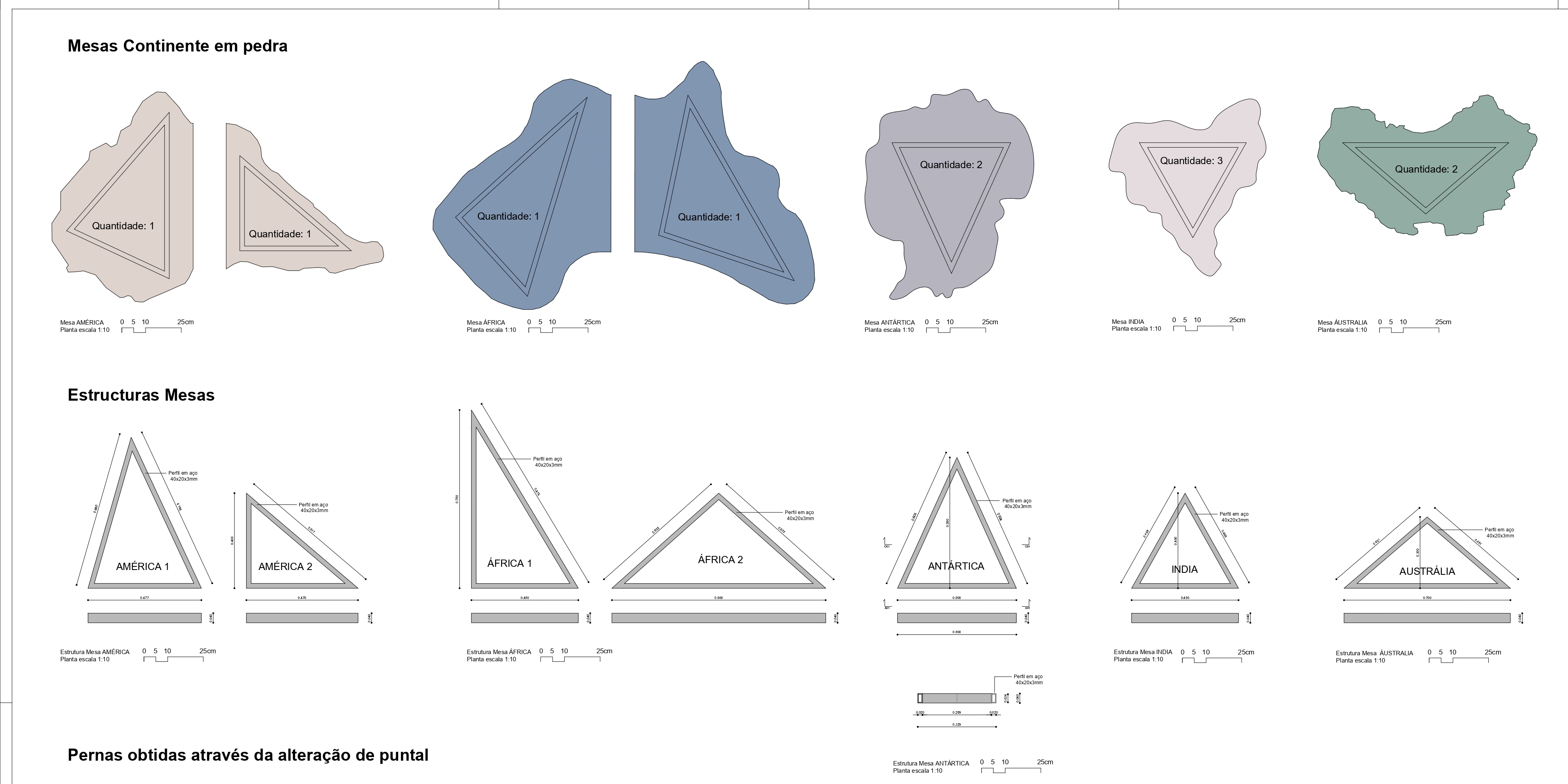 No total, foram produzidas 14 mesas, organizadas como fragmentos geográficos que evocam as diferentes massas continentais do antigo Gondwana: uma África (dividida em duas partes), oito Índias, duas Antártidas, uma América (também dividida em duas) e duas Austrálias. Esta distribuição reforça a leitura do conjunto como uma composição modular que, quando articulada, permite reconstruir simbolicamente o supercontinente original através das suas partes.