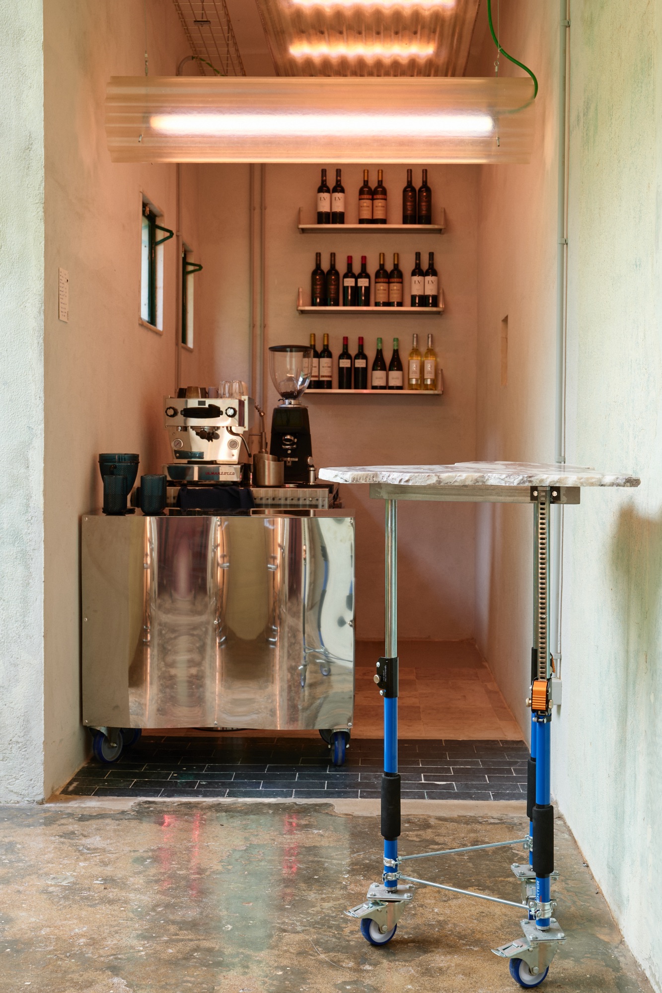 The tables were designed to be mobile and adaptable: equipped with wheels and extendable legs, they can serve as both reading tables and display units, allowing for different spatial configurations depending on the bookstore’s events and uses.