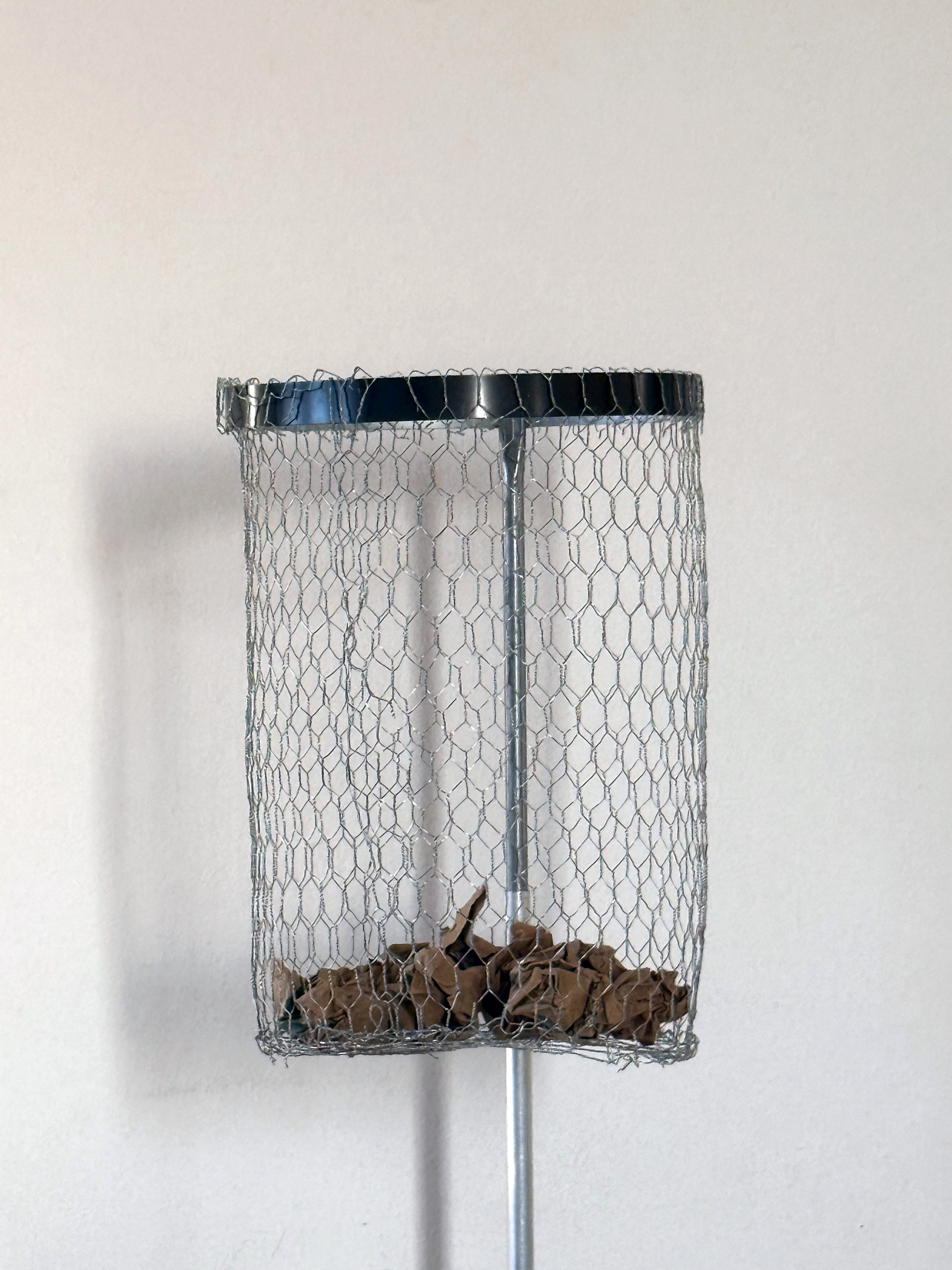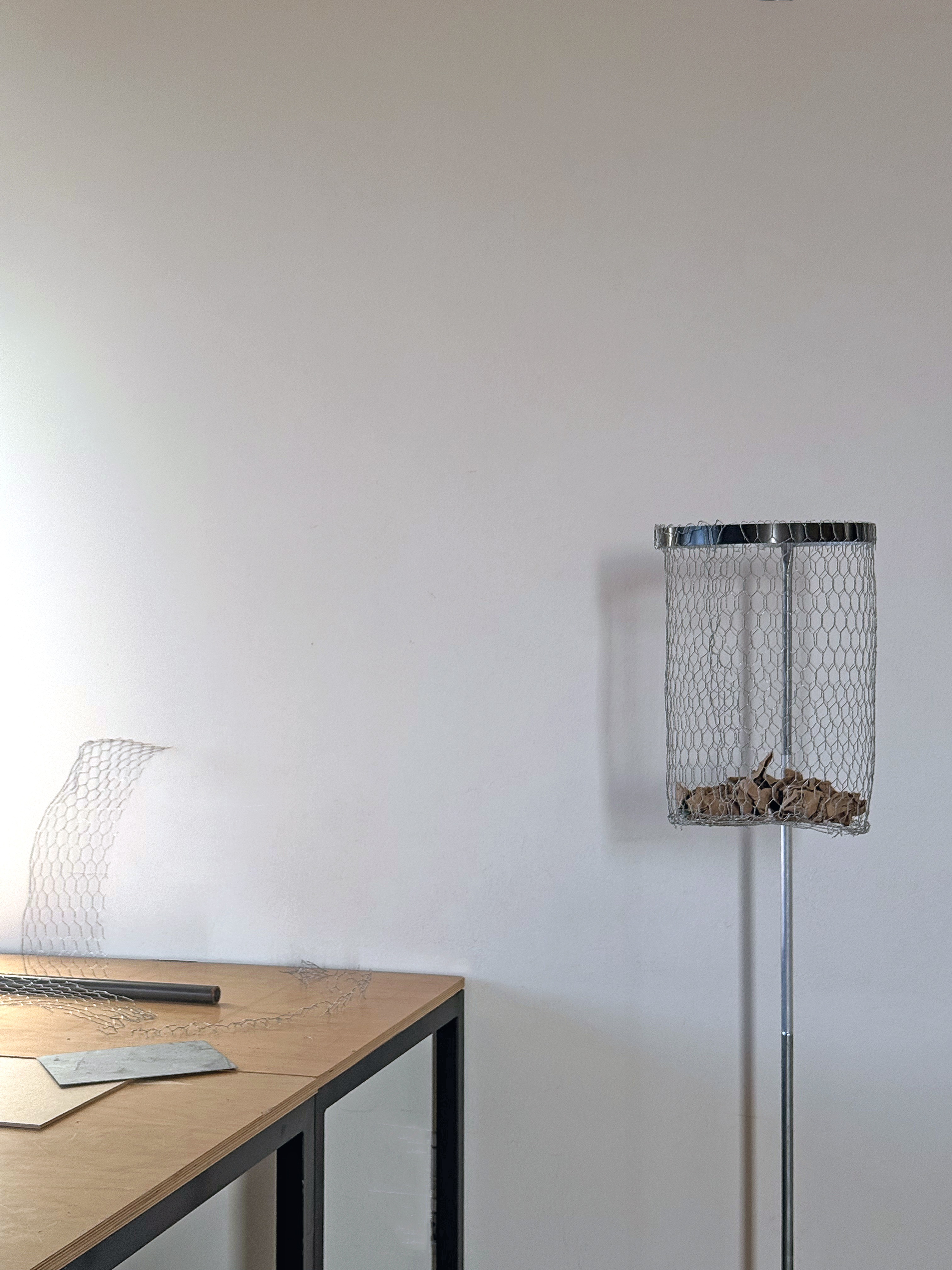 Lighting pieces were also developed, exploring the formal and expressive qualities of materials, such as a lamp that recreates the silhouette of a mountain from fractured marble edges, and another built from bent metal sheets. Other projects include a wooden screen that uses the natural flexibility of veneer sheets to create structural curves, and a playful paper collection system, reinterpreted as a basketball hoop, transforming an everyday action into a playful gesture.