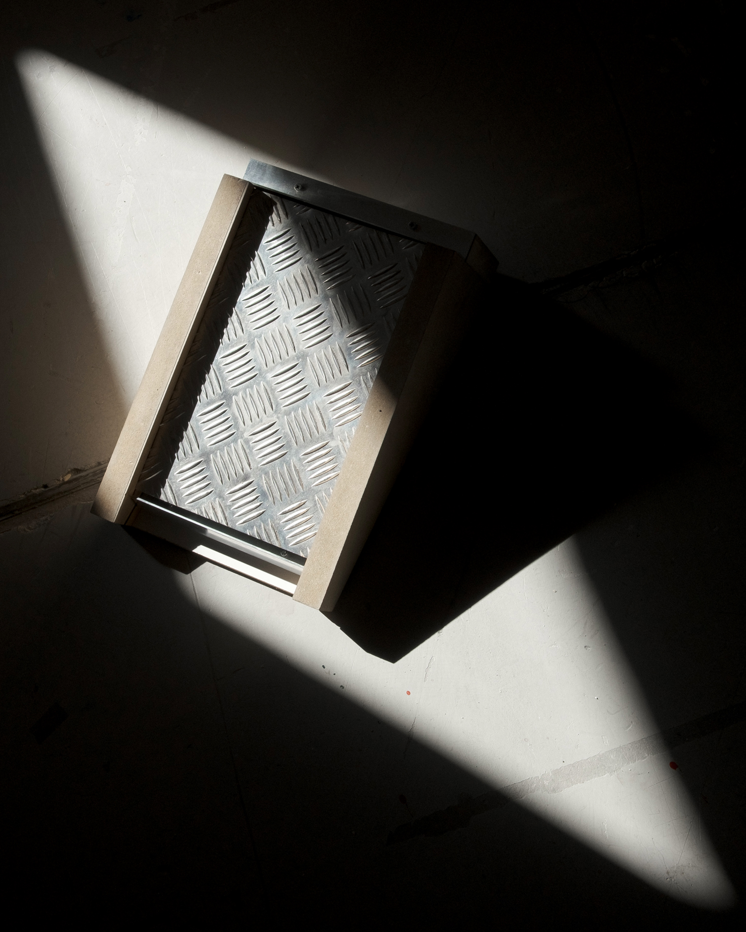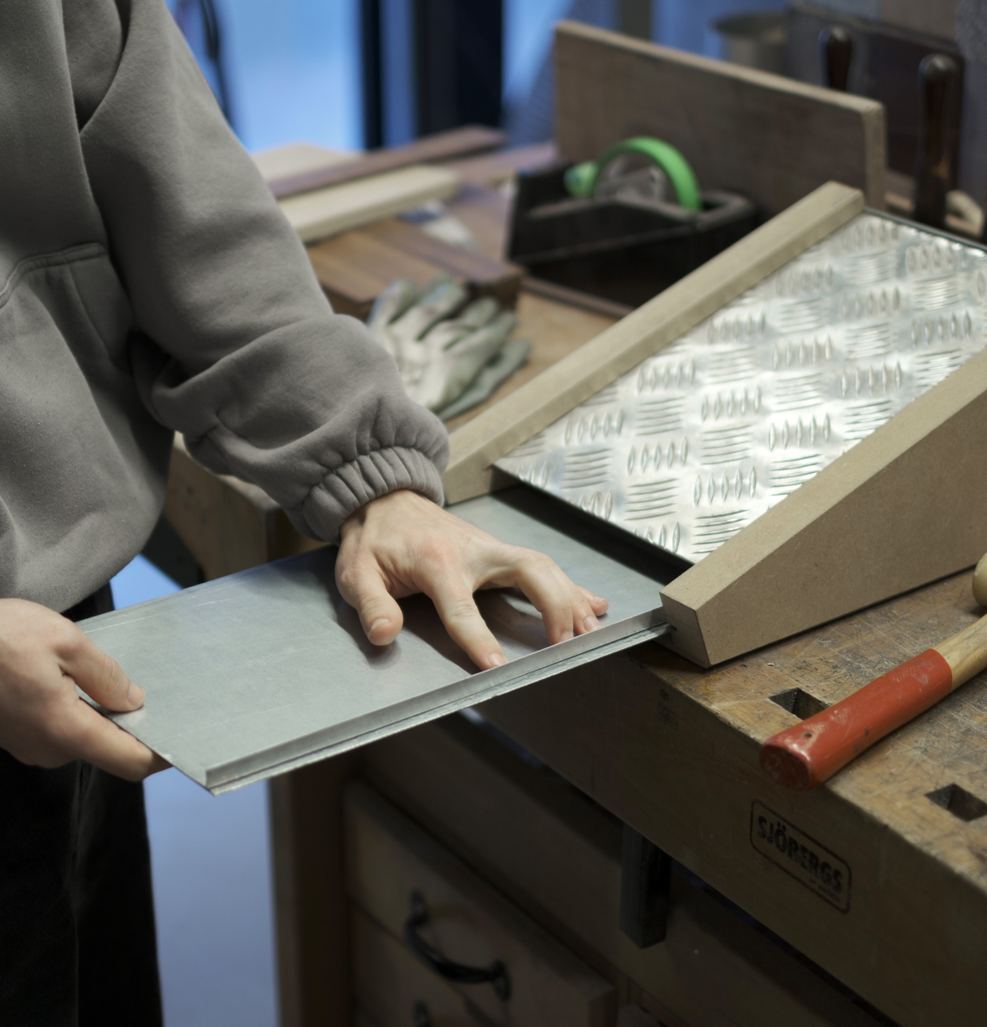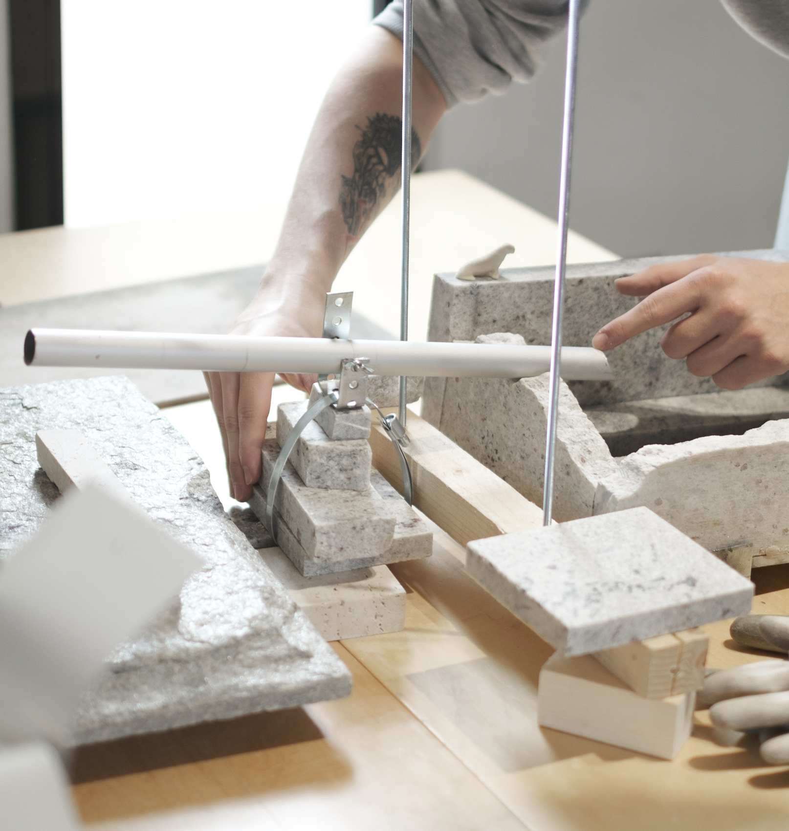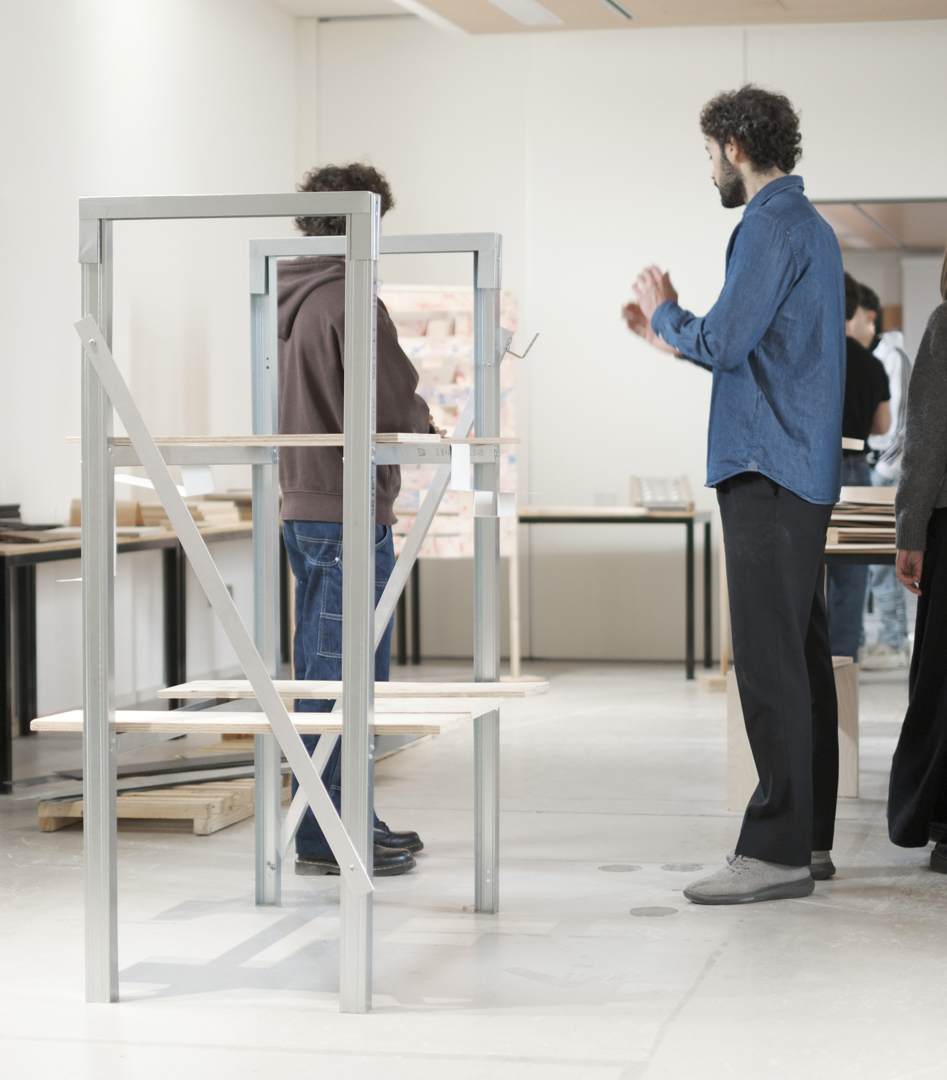 From this process emerged objects that directly reflect the properties and constraints of the available materials, revealing diverse approaches to design. Among the outcomes are a shoe-cleaning device made from anti-slip metal sheets, incorporating a hidden compartment for collecting dirt; a reconfigurable shelving unit developed from aluminum profiles, allowing multiple compositions through adjustable wooden shelves, a fountain inspired by Japanese tradition, where stone elements are held together by pressure without permanent fixings.