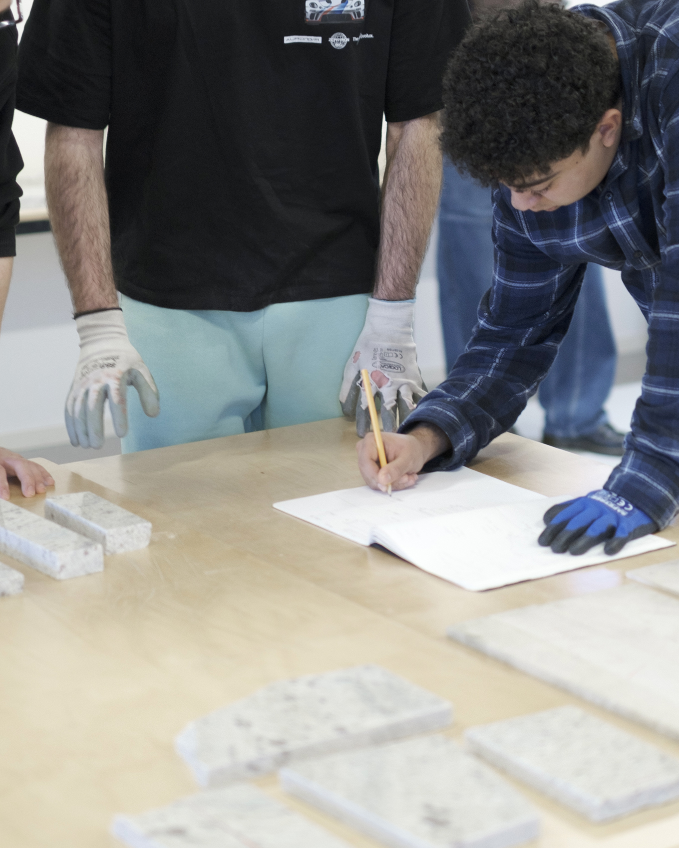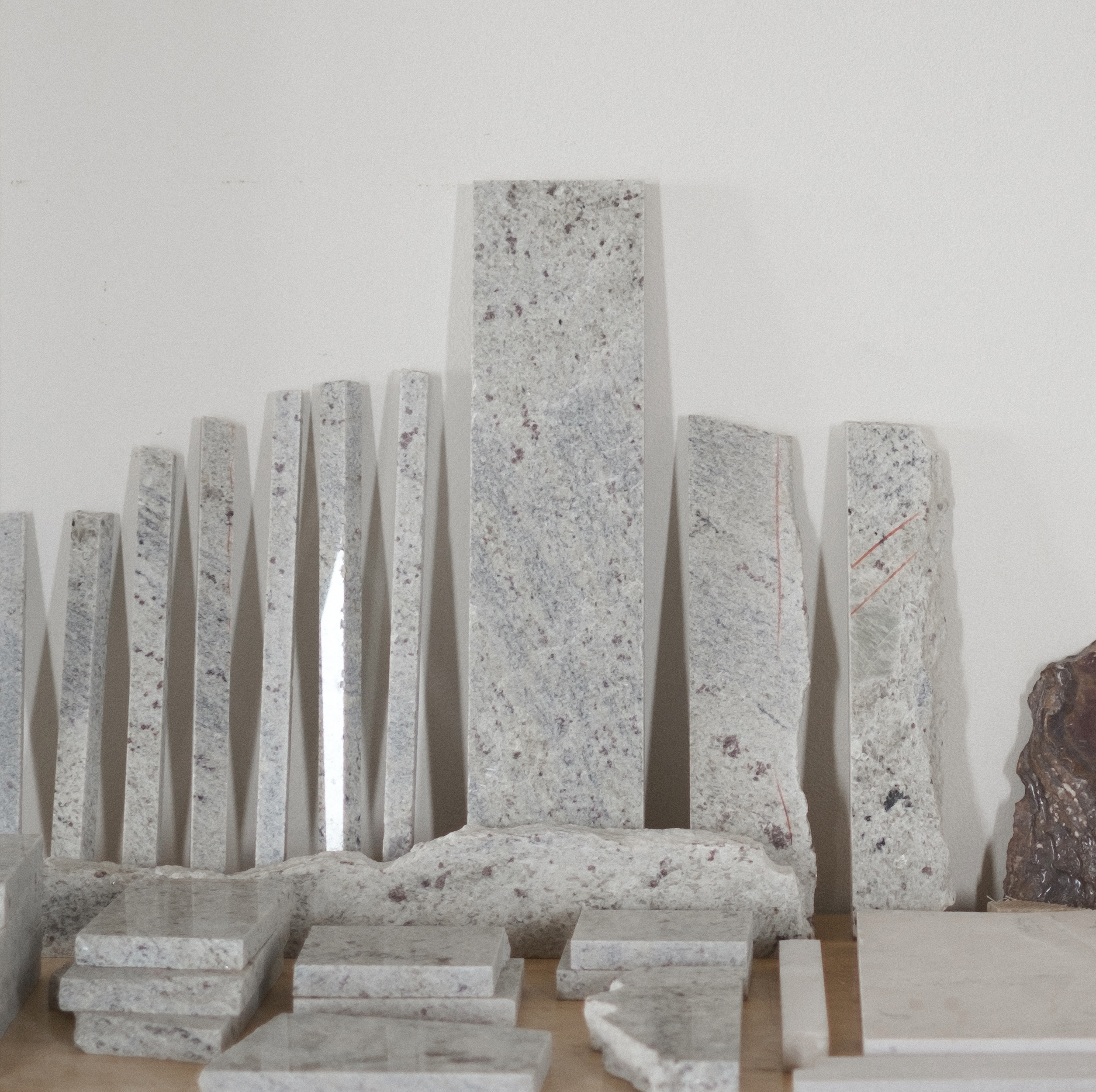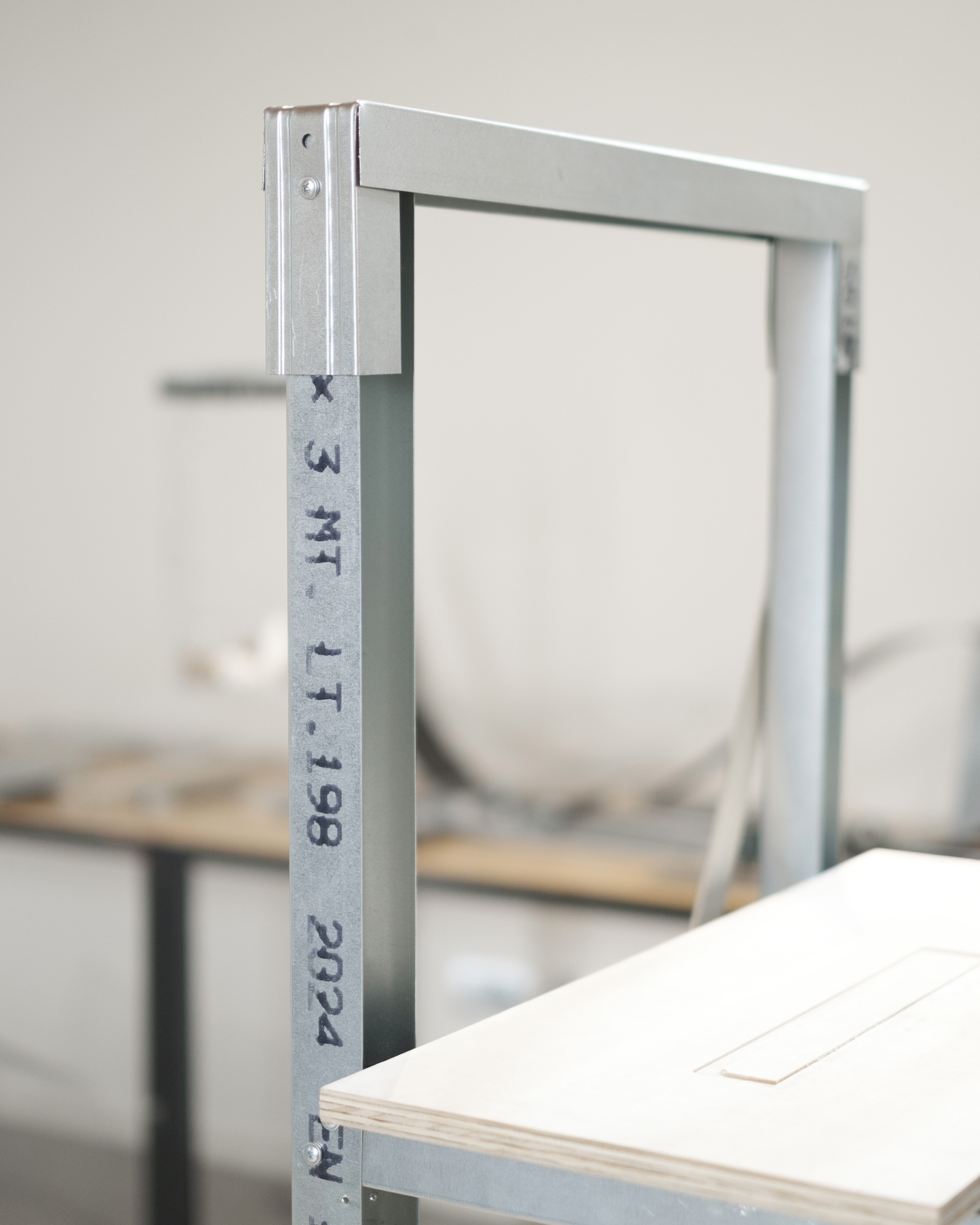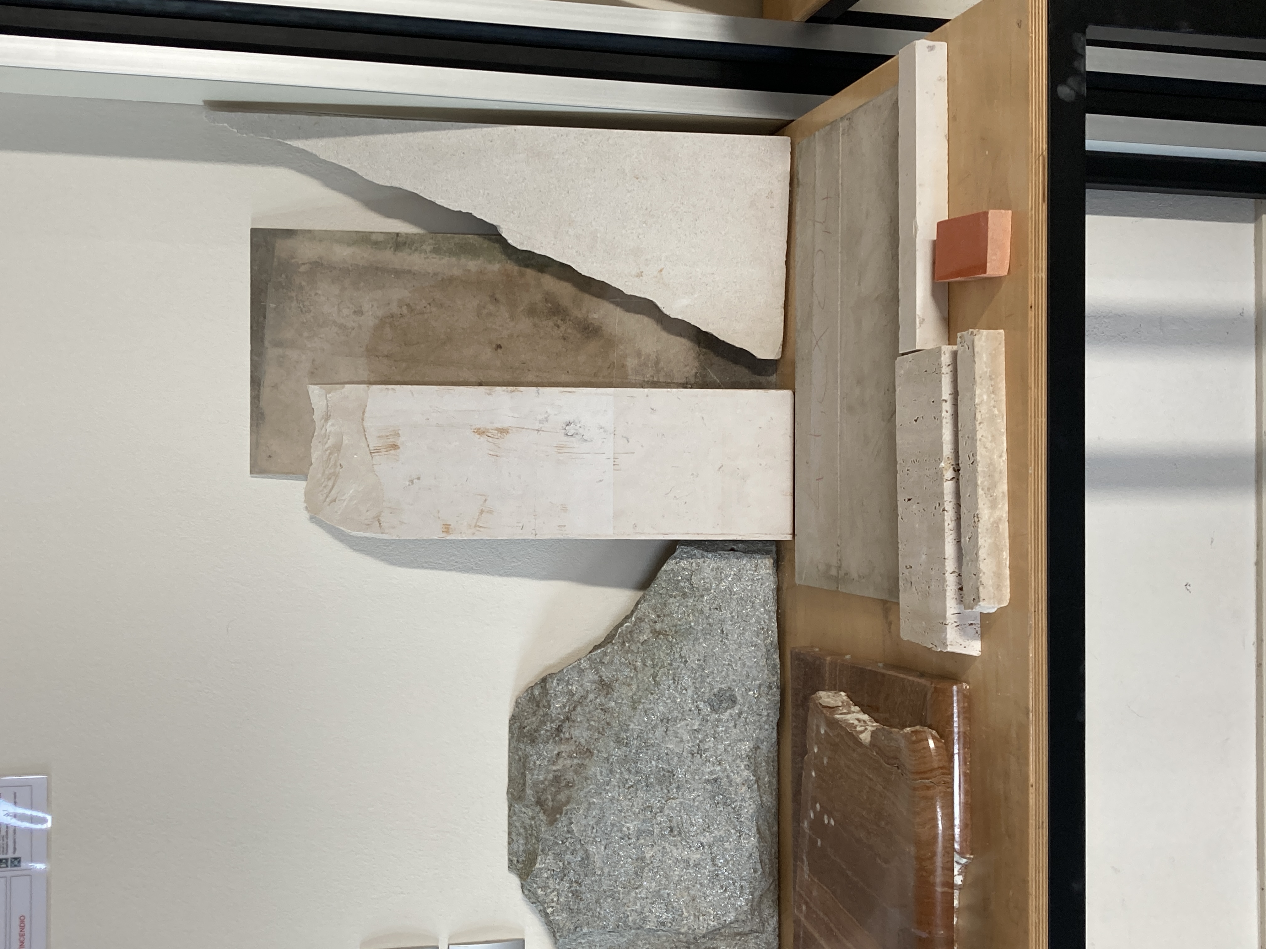 From this process emerged objects that directly reflect the properties and constraints of the available materials, revealing diverse approaches to design. Among the outcomes are a shoe-cleaning device made from anti-slip metal sheets, incorporating a hidden compartment for collecting dirt; a reconfigurable shelving unit developed from aluminum profiles, allowing multiple compositions through adjustable wooden shelves, a fountain inspired by Japanese tradition, where stone elements are held together by pressure without permanent fixings.