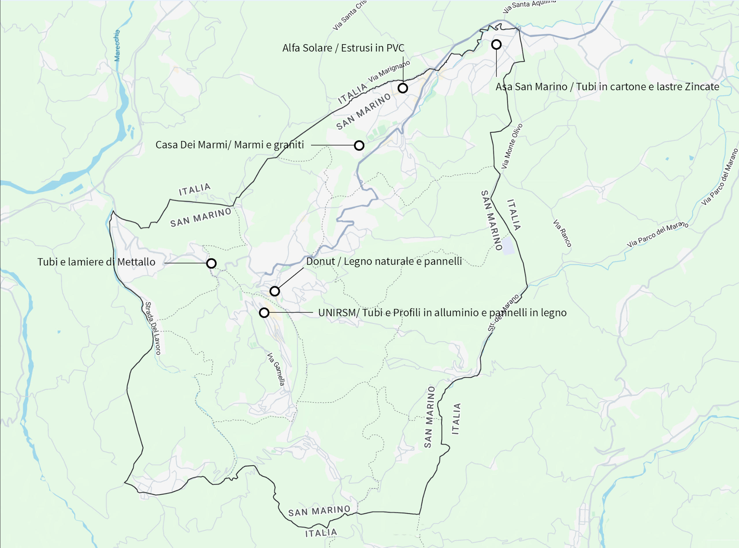 Os materiais utilizados foram recuperados de cinco empresas do território sanmarinense e da própria universidade, incluindo tubos de cartão industrial, chapas de aço zincado, perfis extrudidos de PVC com defeito, excedentes de mármore e granito, metais diversos, painéis de madeira e derivados, entre outros.