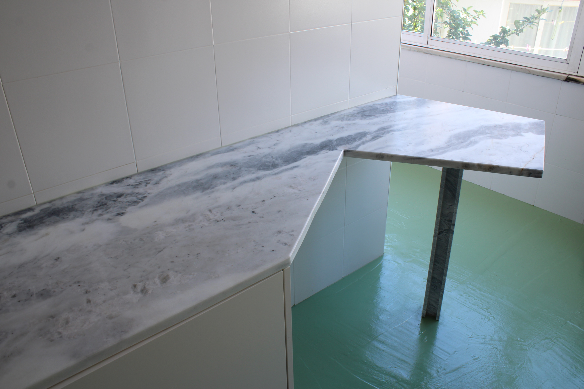 Both countertops were built using surplus stone slabs, repurposing unsold stock materials. The island is supported by a column made from two C-profile water pipes also from deadstock of old stonework.